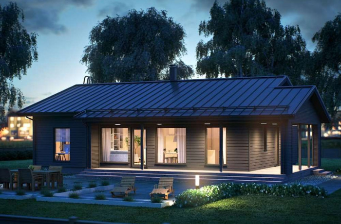 1. Стеновой комплект с окнами КБЕ 70 мм двухкамерный стеклопакет и входной дверью наличники отливы, имитация окрашенная